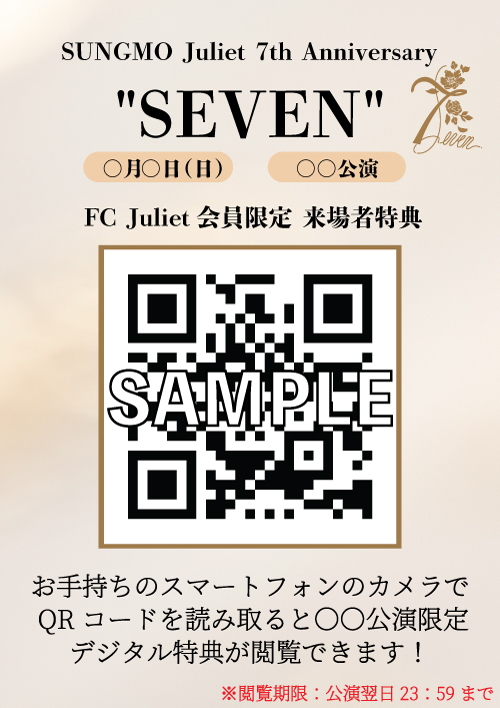 『SUNGMO Juliet 7th Anniversary “SEVEN"』各会場にて、ご来場いただいたオフィシャルファンクラブ「Juliet」会員の皆様は、デジタル特典をご覧いただけます✨